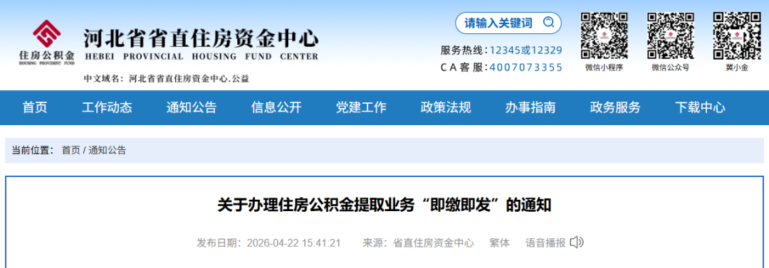 4月22日 河北省省直住房资金中心发布通知 自2026年4月1日起 推出租房提取 偿还省直住房公积金贷款提取 “即缴即发”服务 ![]() 关于办理住房公积金提取业务“即缴即发”的通知 尊敬的缴存职工: 河北省省直住房资金中心自2026年4月1日起推出租房提取、偿还省直住房公积金贷款提取“即缴即发”服务,办理流程如下: 符合提取条件的缴存职工携带身份证、个人银行卡,前往省直住房公积金服务大厅或各服务网点进行签约。签约后,单位缴存资金到账后自动划转至个人银行卡。 河北省省直住房资金中心 2026年4月22日 新闻多看点 一直以来,住房公积金提取采取“先缴存、再申请、后到账”模式,职工虽每月按时缴存,但实际领取到款项,仍需另行申请并完成相应手续。 为提升资金流转与配置效率,河北省机关事务管理局推出“即缴即发”服务。缴存职工在省直住房公积金服务网点签署《“即缴即发”提取协议》后,无需再提交材料进行申请,其公积金将在单位缴存到账后自动划转至个人银行账户。 缴存即提取、到账无延迟,这意味着,居民用于支付房租、物业费或还贷的可支配收入得到有效补充,家庭消费底气更足,日常消费潜力也将进一步释放。 据介绍,目前,租房提取、还贷提取“即缴即发”服务已在“河北省省直住房公积金”微信小程序上线,今年年底前,服务还将覆盖购房和建造翻建大修、加装电梯、低保提取等情形。五类提取情形全部上线后,省直住房公积金预计将有36.57亿元资金可实现当月发放。 |